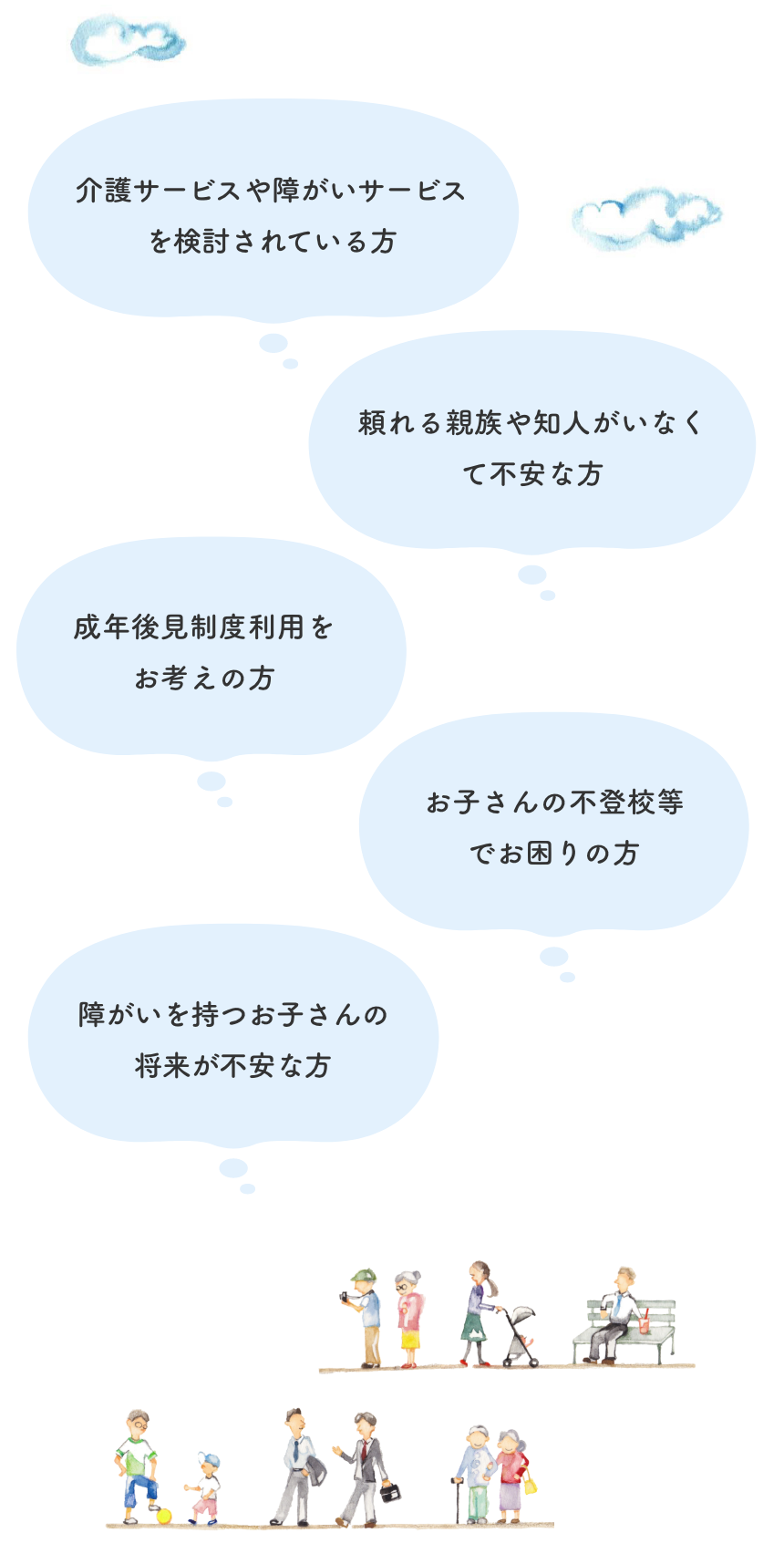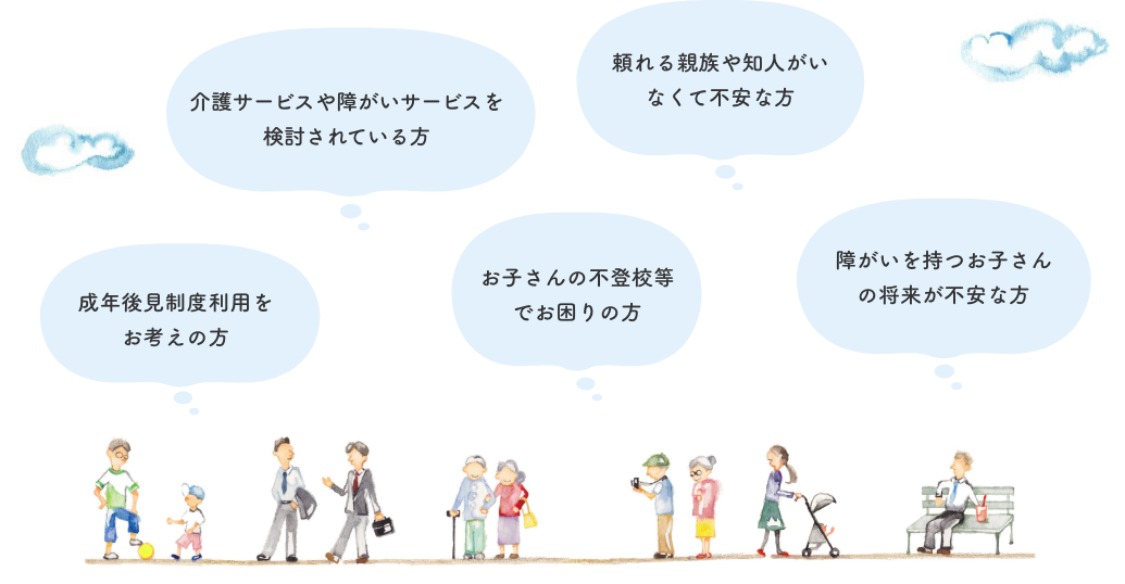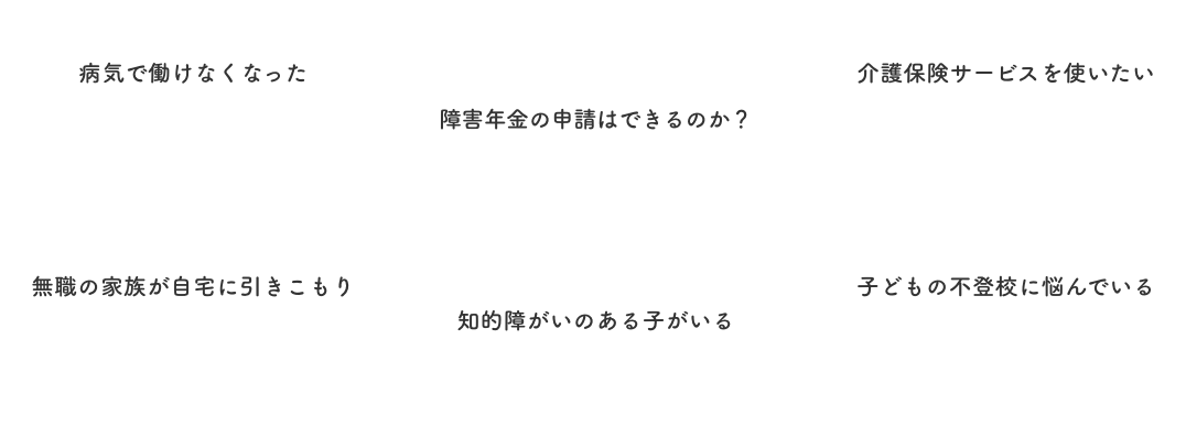 生活の中にはさまざまな不安や心配ごとがあるものです。当事務所では、福祉や暮らしに関することを総合的にご相談いただけます。